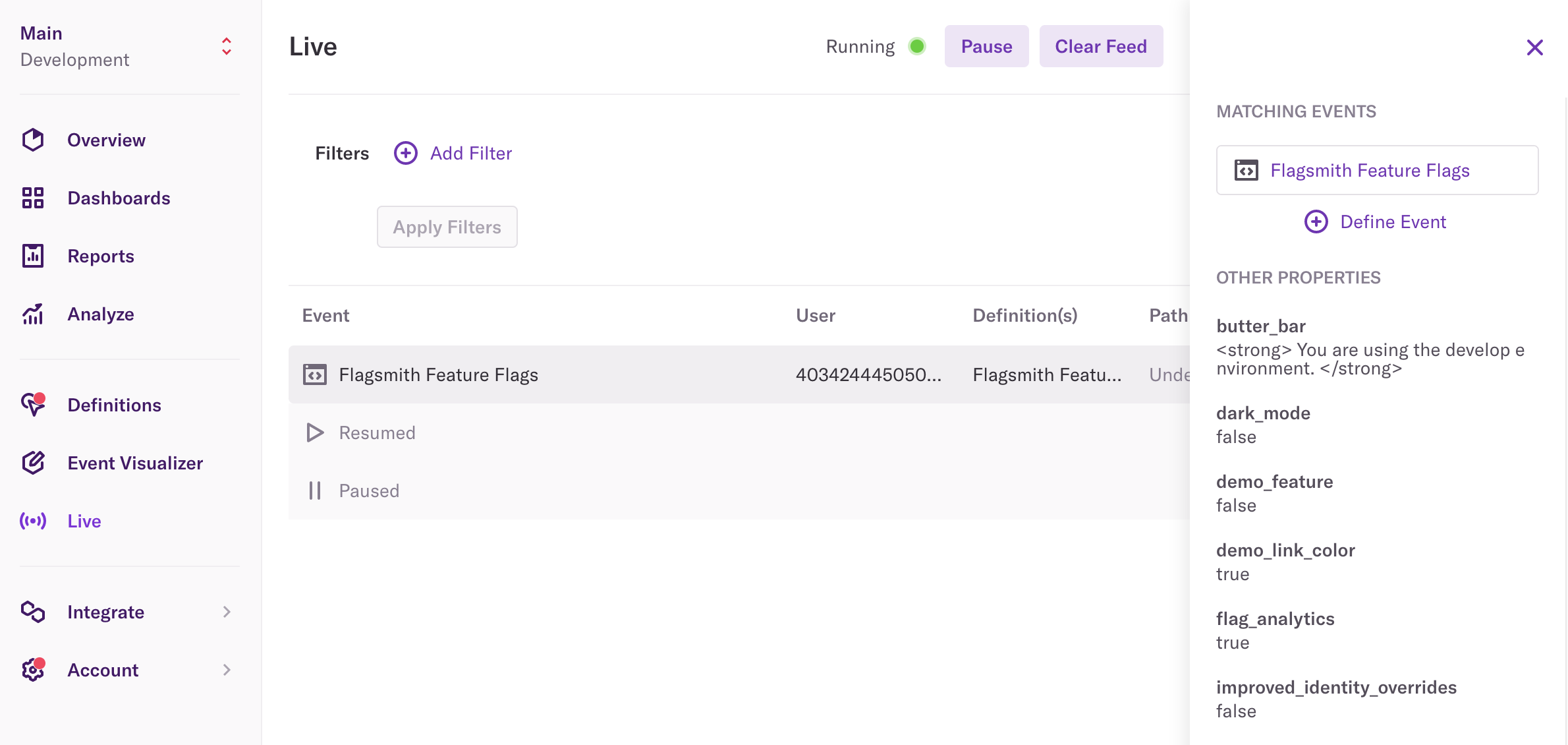 And then take a look in our Heap dashboard, you can see the user and the flag data that has been sent to the Heap platform.